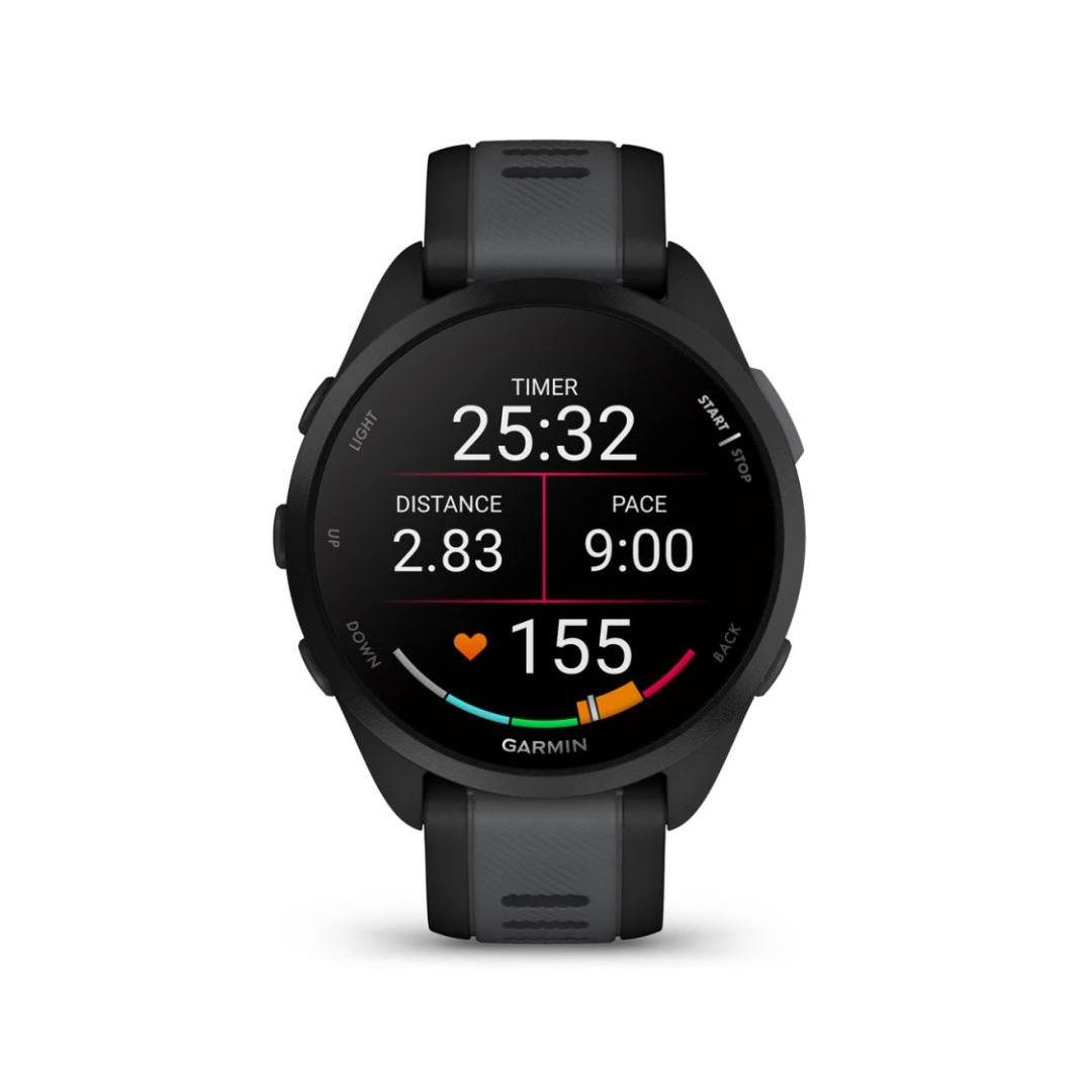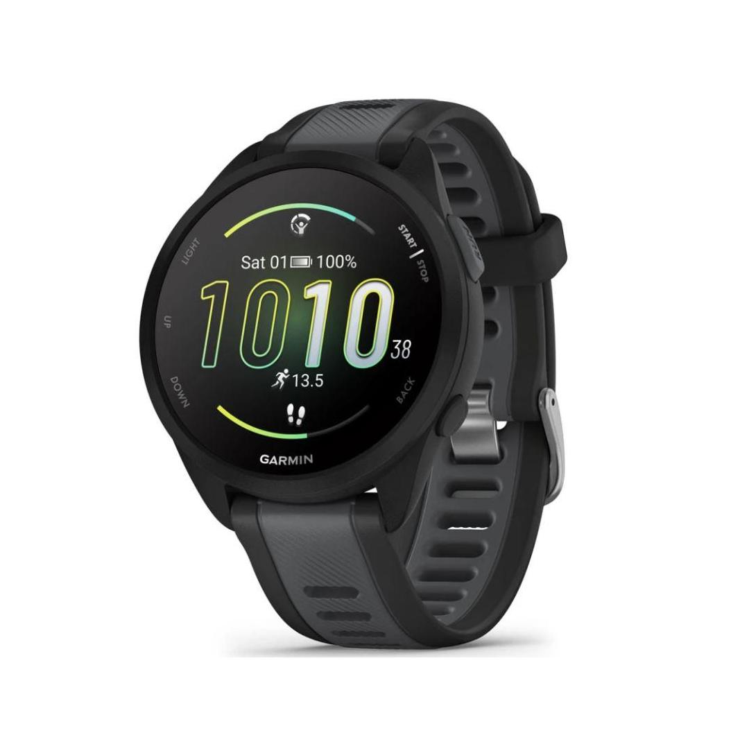 Forerunner® 165|Screen 1.2"|Display technology AMOLED|Resolution 390 x 390|Wireless connections WLAN/Bluetooth|Memory 4 GB|GPS|Colour Black|Dimensions 43 x 43 x 11.6 mm|Weight 0.039 kg