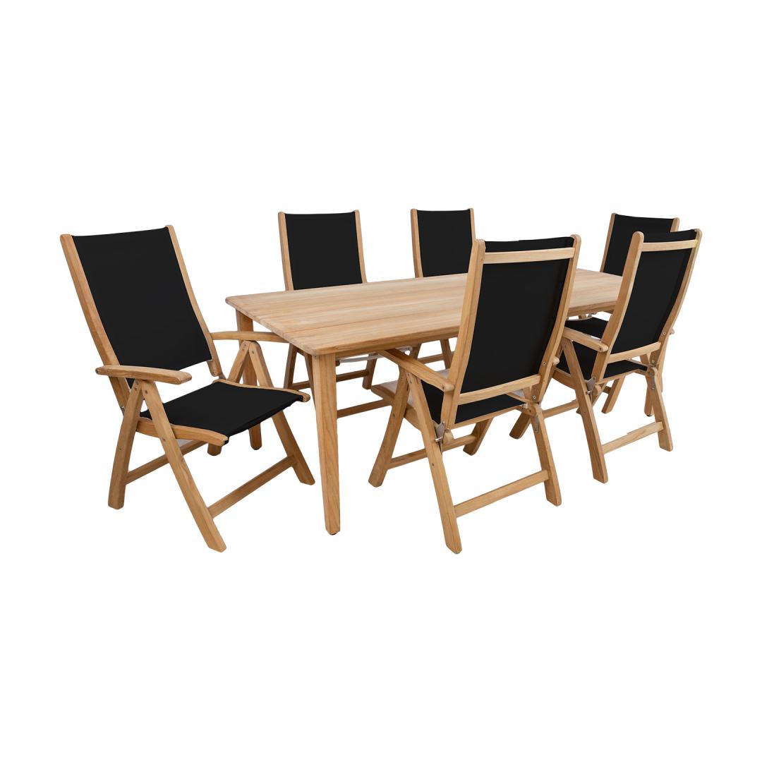 Söögilauakomplekt MALDIVE laud ja 6 tooli. Laua mõõdud on 220x100xH75cm. Laud on valmistatud hoolikalt valitud küpsest tiikpuust. Puidu peenlihvitud pind on täielikult naturaalne. Tänu suurele looduslike õlide sisaldusele on tiikpuu väga vastupidav niiskuse ning puidukahjurite suhtes ning ei vaja täiendavat viimistlemist või õlitamist. Tooli üldmõõdud on 60x70xH110cm, istme laius 48cm, istme sügavus 46cm, istme kõrgus 45cm, seljatoe kõrgus 70cm, käetoe kõrgus maast 66cm. Kaalupiirang 120kg. Tooli raam on valmistatud tiikpuust. Iste ja seljatugi on valmistatud mustast batylinest. Batyline materjali kõige olulisem omadus on selle nõtkus ja optimaalne istumismugavus. Lisaks erakordsele mehaanilisele tugevusele on materjalil kõrge keemiline vastupidavus. Sünteetiline kate tagab ülikõrge ilmastiku- ja UV-kindluse. Batyline ei ima niiskust, tänu sellele kuivab materjal väga kiiresti ja on maksimaalselt pleki- ja hallituskindel ning lihtsalt puhastatav. Seljatoe reguleerimiseks tõstke käetoed üles, valige sobiv seljatoe asend ja fikseerige käetoed. Võimalik on valida 6 erineva positsiooni vahel. Tiikpuu talub väga hästi erinevaid ilmastikutingimusi ja säilitab oma suurepärase välimuse ja parimad omadused pikkadeks aastateks. Mida küpsem on puit, seda suurem on selle tihedus ja õli sisaldus ja seda vastupidavam ja stabiilsem on see ilmastikutingimuste suhtes. Päikesevalguse ja niiskuse mõjul muutub puidu pind aja jooksul kaunilt hõbehalliks. Selline värvimuutus on loomulik ning ei mõjuta puidu kvaliteeti. HOOLDUS: puhastage mööblit regulaarselt, kaitske liigniiskuse ja UV kiirguse eest. Puidust pindade värskendamiseks võib need soovikorral kergelt üle lihvida. Välitingimustes kasutatava mööbli eluea pikendamiseks soovitame kasutada välimööbli katteid. HOIUSTAMINE: suvehooaja lõppedes soovitame aiamööblit hoiustada siseruumides. Puhastage ja kuivatage mööbel enne hoiule panekut. Kasutage hoiustamiseks kuiva ning hea ventilatsiooniga ruumi.