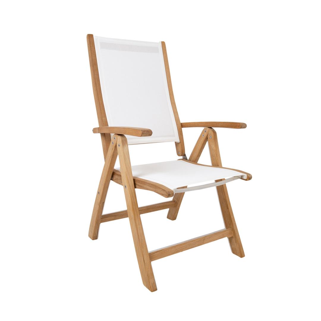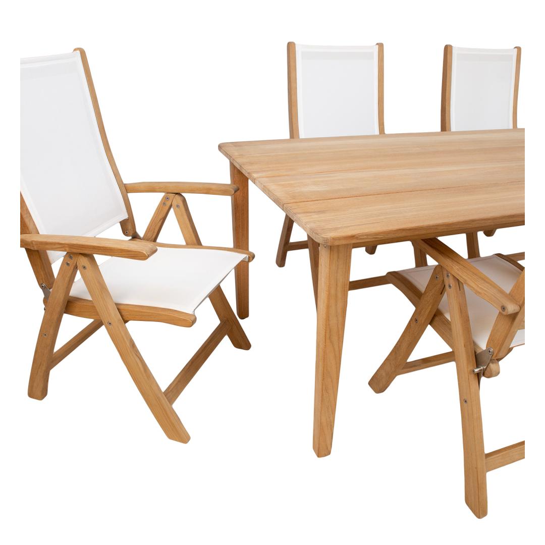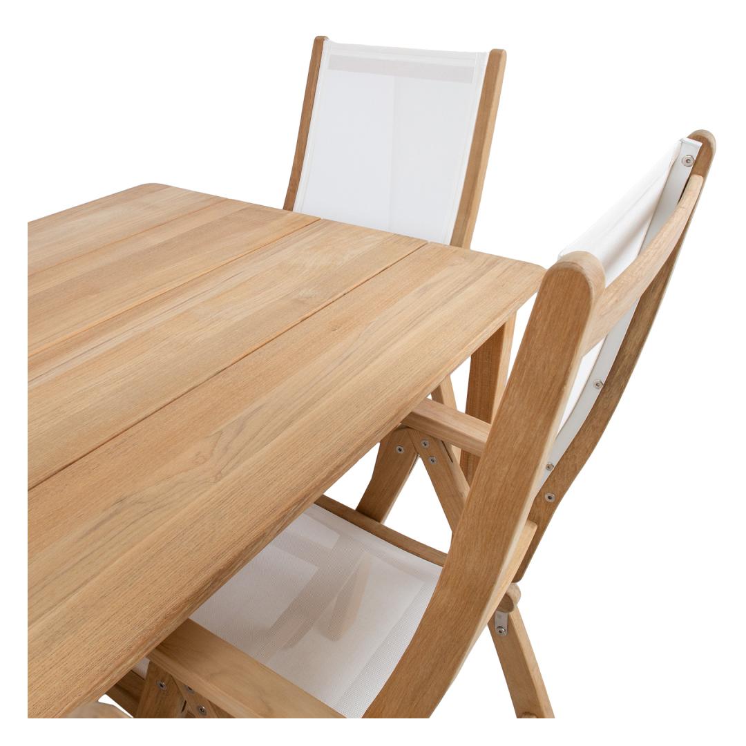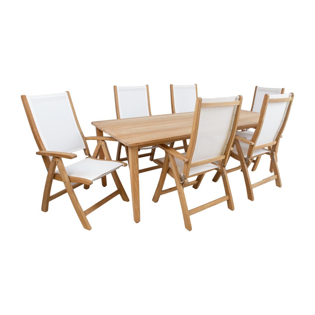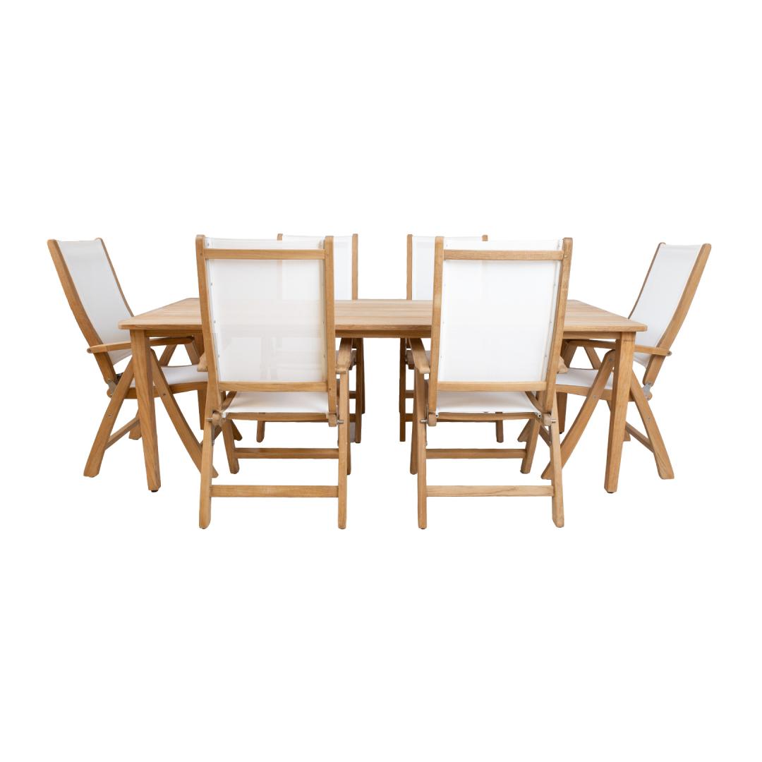 Söögilauakomplekt MALDIVE laud ja 6 tooli. Laua mõõdud on 220x100xH75cm. Laud on valmistatud hoolikalt valitud küpsest tiikpuust. Puidu peenlihvitud pind on täielikult naturaalne. Tänu suurele looduslike õlide sisaldusele on tiikpuu väga vastupidav niiskuse ning puidukahjurite suhtes ning ei vaja täiendavat viimistlemist või õlitamist. Tooli üldmõõdud on 60x70xH110cm, istme laius 48cm, istme sügavus 46cm, istme kõrgus 45cm, seljatoe kõrgus 70cm, käetoe kõrgus maast 66cm. Kaalupiirang 120kg. Tooli raam on valmistatud tiikpuust. Iste ja seljatugi on valmistatud valgest batylinest. Batyline materjali kõige olulisem omadus on selle nõtkus ja optimaalne istumismugavus. Lisaks erakordsele mehaanilisele tugevusele on materjalil kõrge keemiline vastupidavus. Sünteetiline kate tagab ülikõrge ilmastiku- ja UV-kindluse. Batyline ei ima niiskust, tänu sellele kuivab materjal väga kiiresti ja on maksimaalselt pleki- ja hallituskindel ning lihtsalt puhastatav. Seljatoe reguleerimiseks tõstke käetoed üles, valige sobiv seljatoe asend ja fikseerige käetoed. Võimalik on valida 6 erineva positsiooni vahel. Tiikpuu talub väga hästi erinevaid ilmastikutingimusi ja säilitab oma suurepärase välimuse ja parimad omadused pikkadeks aastateks. Mida küpsem on puit, seda suurem on selle tihedus ja õli sisaldus ja seda vastupidavam ja stabiilsem on see ilmastikutingimuste suhtes. Päikesevalguse ja niiskuse mõjul muutub puidu pind aja jooksul kaunilt hõbehalliks. Selline värvimuutus on loomulik ning ei mõjuta puidu kvaliteeti. HOOLDUS: puhastage mööblit regulaarselt, kaitske liigniiskuse ja UV kiirguse eest. Puidust pindade värskendamiseks võib need soovikorral kergelt üle lihvida. Välitingimustes kasutatava mööbli eluea pikendamiseks soovitame kasutada välimööbli katteid. HOIUSTAMINE: suvehooaja lõppedes soovitame aiamööblit hoiustada siseruumides. Puhastage ja kuivatage mööbel enne hoiule panekut. Kasutage hoiustamiseks kuiva ning hea ventilatsiooniga ruumi.