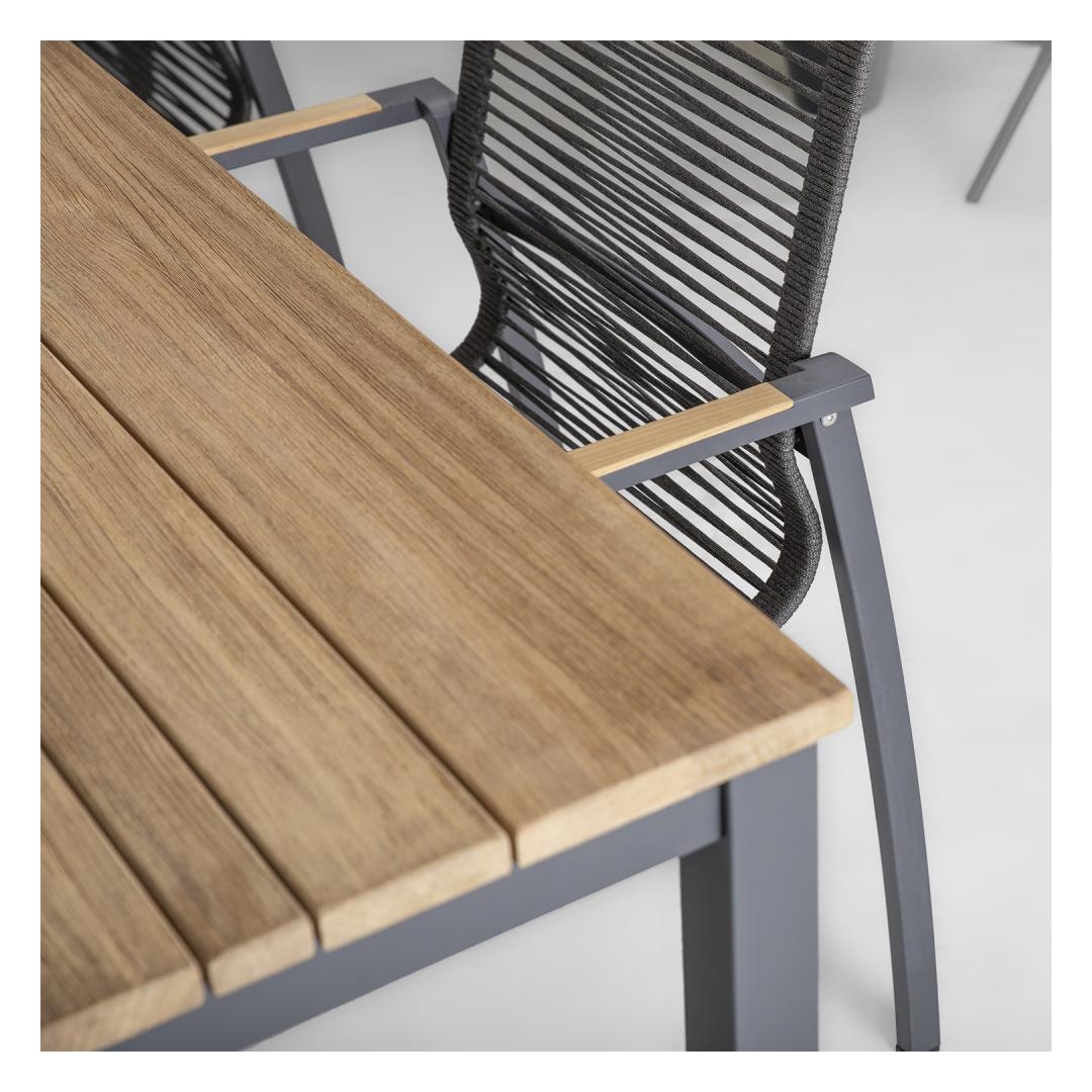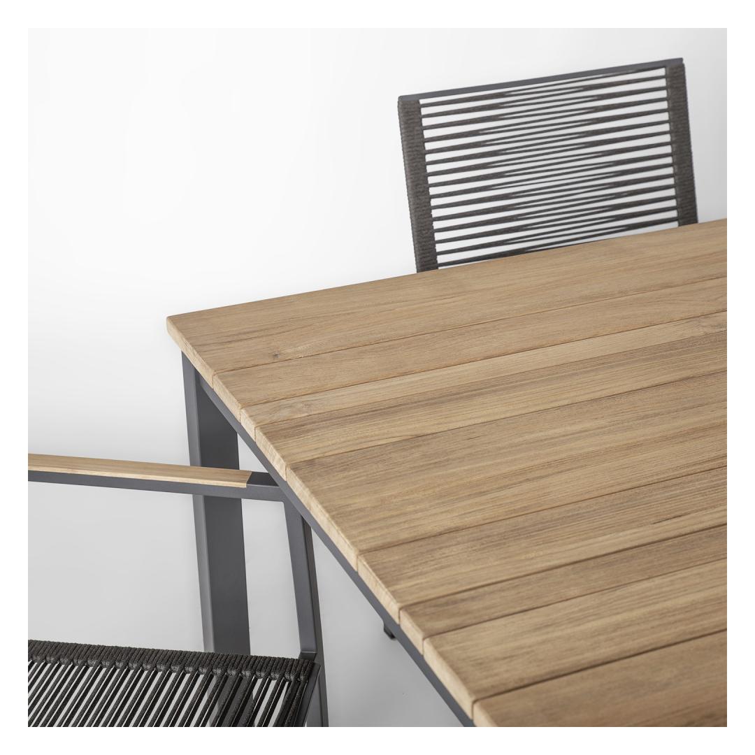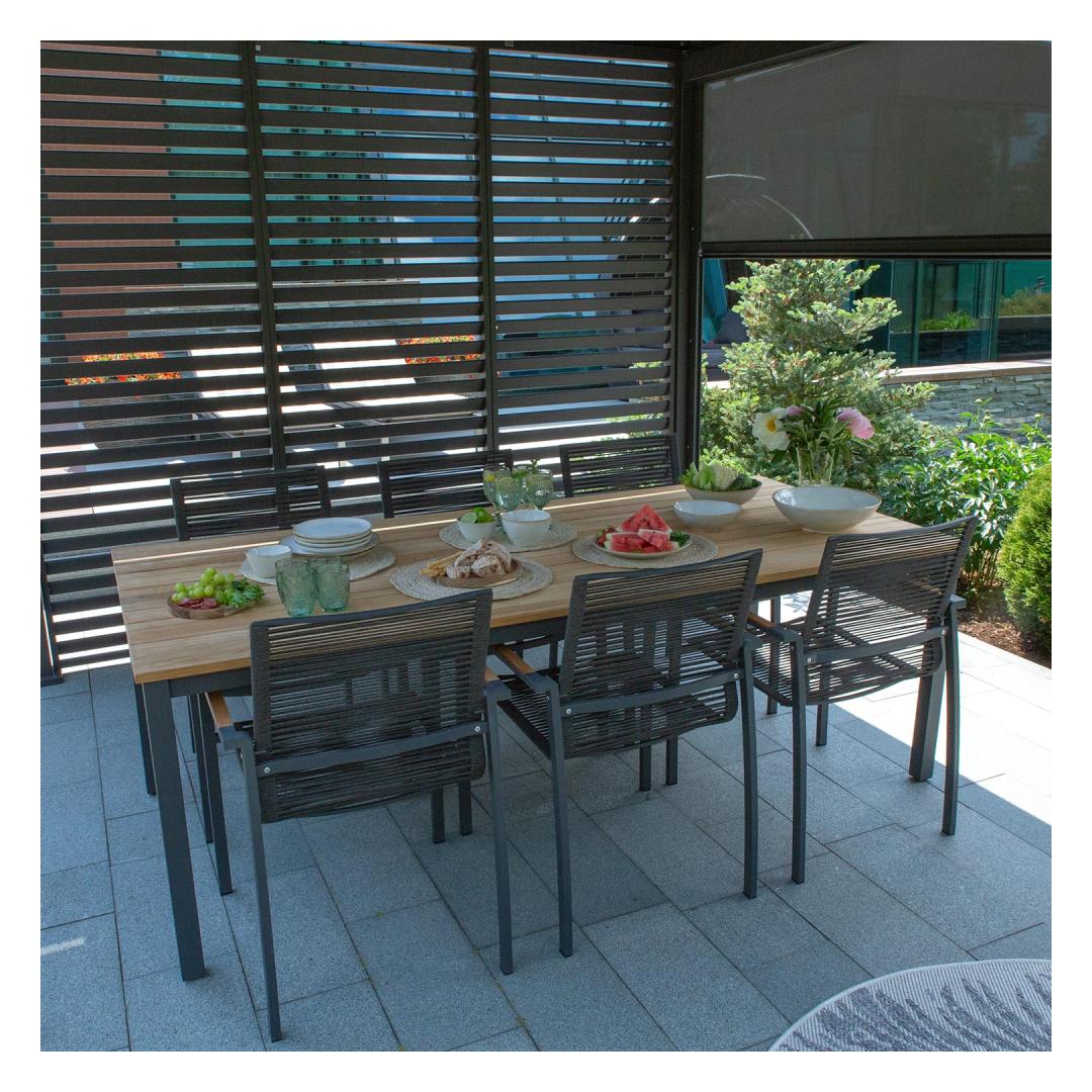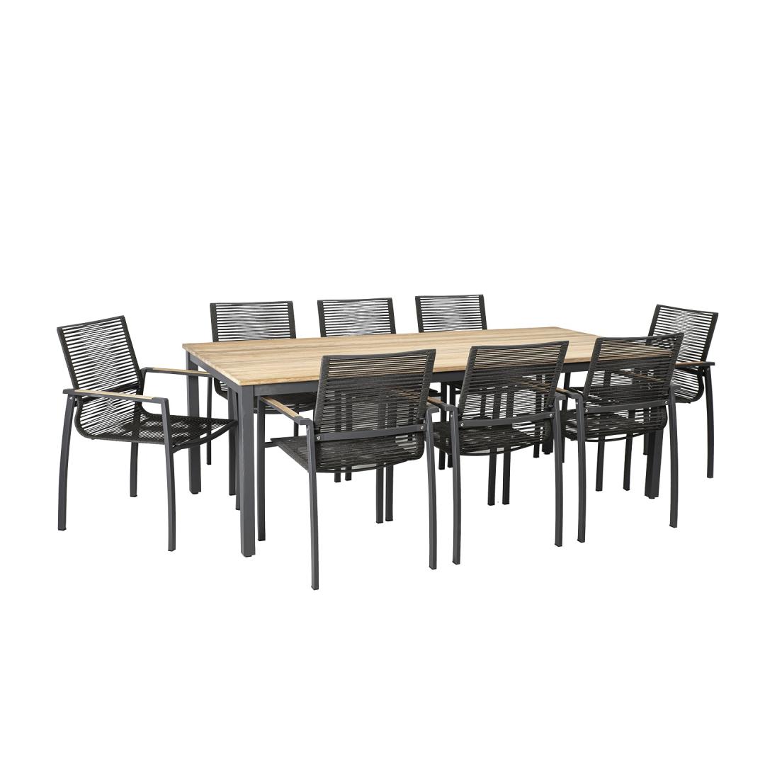 Söögilauakomplekt MONTANA laud ja 8 tooli. Laua mõõdud on 220x100xH76cm. Lauaplaat on valmistatud A-klassi tiikpuust. Peenlihvitud pind on täielikult naturaalne oma looduslikus ilus ning seda ei ole õlitatud ega muul viisil keemiliselt töödeldud. Laua jalad ja alusraam on valmistatud roostevabast terasest ja viimistletud halli pulbervärviga. A-klassi tiikpuu on täiuslik looduslik materjal luksusliku õuemööbli valmistamiseks. Puidu süü on tihe ja ühtlane ning kauni sametise läikega, värvus on kuldse nisu-ja meetoonides. Tänu suurele looduslike õlide sisaldusele on tiikpuu väga vastupidav niiskuse ning puidukahjurite suhtes. Tiikpuu talub väga hästi erinevaid ilmastikutingimusi ja säilitab oma suurepärase välimuse ja parimad omadused pikkadeks aastateks. Päikesevalguse ja niiskuse mõjul muutub laua pind aja jooksul kaunilt hõbehalliks. Selline värvimuutus on loomulik ning ei mõjuta puidu kvaliteeti. Eksklusiivne tiikpuust laud sobib hästi ka siseruumides kasutamiseks. Tooli roostevabast terasest raam on viimistletud halli pulbervärviga. Iste ja seljatugi on kaetud nöörpunutisega. Käetugesid kaunistavad naturaalsest tiikpuust liistud. Toolid on virnastatavad ning nende hoiustamine on lihtne ja ruumi säästev. Tooli üldmõõdud on 60x61xH90cm, istme kõrgus 45cm, istme laius 48cm, istme sügavus 48cm, seljatoe kõrgus 48cm, käetoe kõrgus maast 65cm. Kaalupiirang 120kg. Toode on muutlikes ilmastikutingimustes vastupidav ja lihtsalt hooldatav. Välitingimustes kasutatava mööbli eluea pikendamiseks soovitame kasutada välimööbli katteid. HOIUSTAMINE: suvehooaja lõppedes soovitame aiamööblit hoiustada siseruumides. Puhastage ja kuivatage mööbel enne hoiule panekut. Kasutage hoiustamiseks kuiva ning hea ventilatsiooniga ruumi. Söögilauakomplekt MONTANA laud ja 8 tooli. Laua mõõdud on 220x100xH76cm. Lauaplaat on valmistatud A-klassi tiikpuust. Peenlihvitud pind on täielikult naturaalne oma looduslikus ilus ning seda ei ole õlitatud ega muul viisil keemiliselt töödeldud. Laua jalad ja alusraam on valmistatud roostevabast terasest ja viimistletud halli pulbervärviga. A-klassi tiikpuu on täiuslik looduslik materjal luksusliku õuemööbli valmistamiseks. Puidu süü on tihe ja ühtlane ning kauni sametise läikega, värvus on kuldse nisu-ja meetoonides. Tänu suurele looduslike õlide sisaldusele on tiikpuu väga vastupidav niiskuse ning puidukahjurite suhtes. Tiikpuu talub väga hästi erinevaid ilmastikutingimusi ja säilitab oma suurepärase välimuse ja parimad omadused pikkadeks aastateks. Päikesevalguse ja niiskuse mõjul muutub laua pind aja jooksul kaunilt hõbehalliks. Selline värvimuutus on loomulik ning ei mõjuta puidu kvaliteeti. Eksklusiivne tiikpuust laud sobib hästi ka siseruumides kasutamiseks. Tooli roostevabast terasest raam on viimistletud halli pulbervärviga. Iste ja seljatugi on kaetud nöörpunutisega. Käetugesid kaunistavad naturaalsest tiikpuust liistud. Toolid on virnastatavad ning nende hoiustamine on lihtne ja ruumi säästev. Tooli üldmõõdud on 60x61xH90cm, istme kõrgus 45cm, istme laius 48cm, istme sügavus 48cm, seljatoe kõrgus 48cm, käetoe kõrgus maast 65cm. Kaalupiirang 120kg. Toode on muutlikes ilmastikutingimustes vastupidav ja lihtsalt hooldatav. Välitingimustes kasutatava mööbli eluea pikendamiseks soovitame kasutada välimööbli katteid. HOIUSTAMINE: suvehooaja lõppedes soovitame aiamööblit hoiustada siseruumides. Puhastage ja kuivatage mööbel enne hoiule panekut. Kasutage hoiustamiseks kuiva ning hea ventilatsiooniga ruumi.