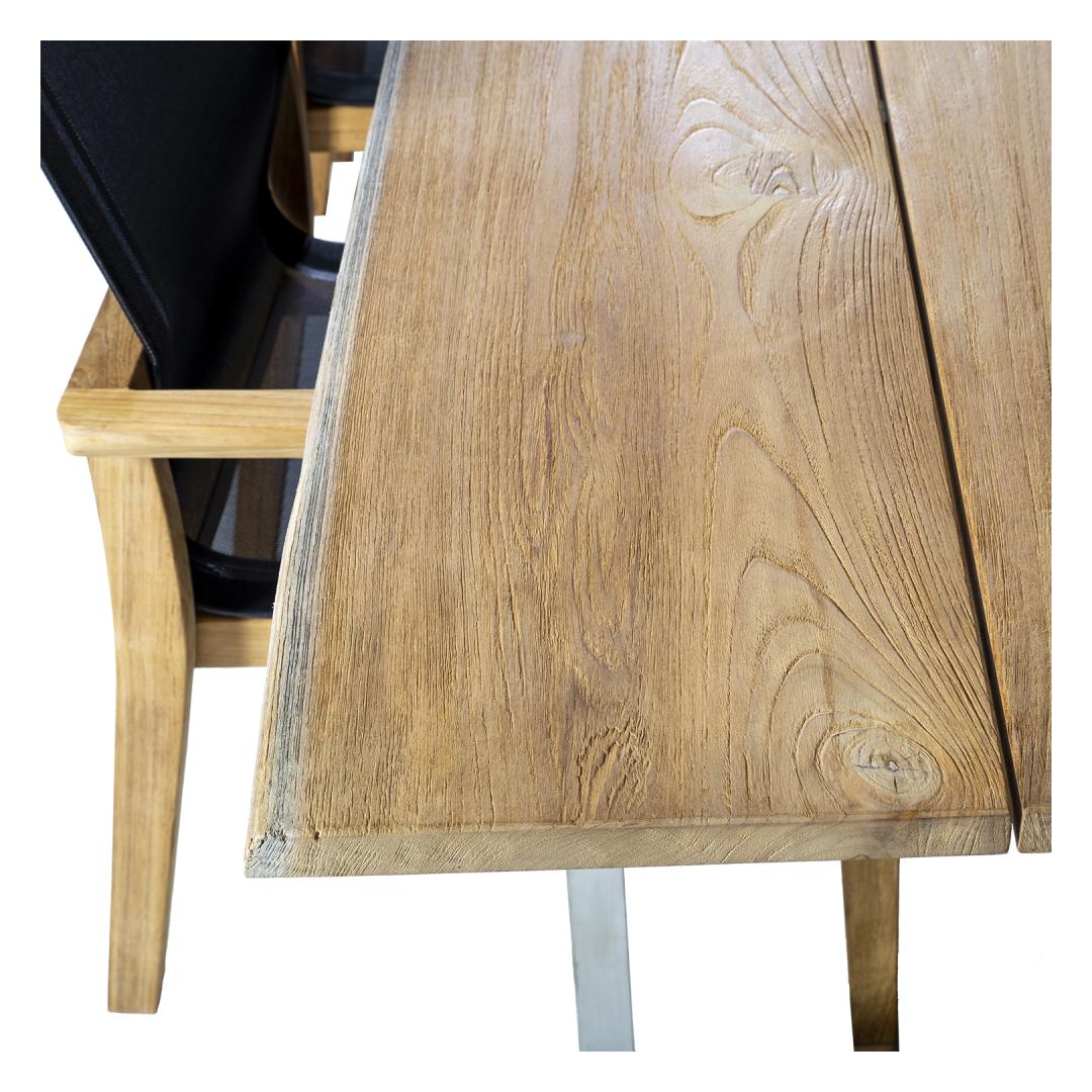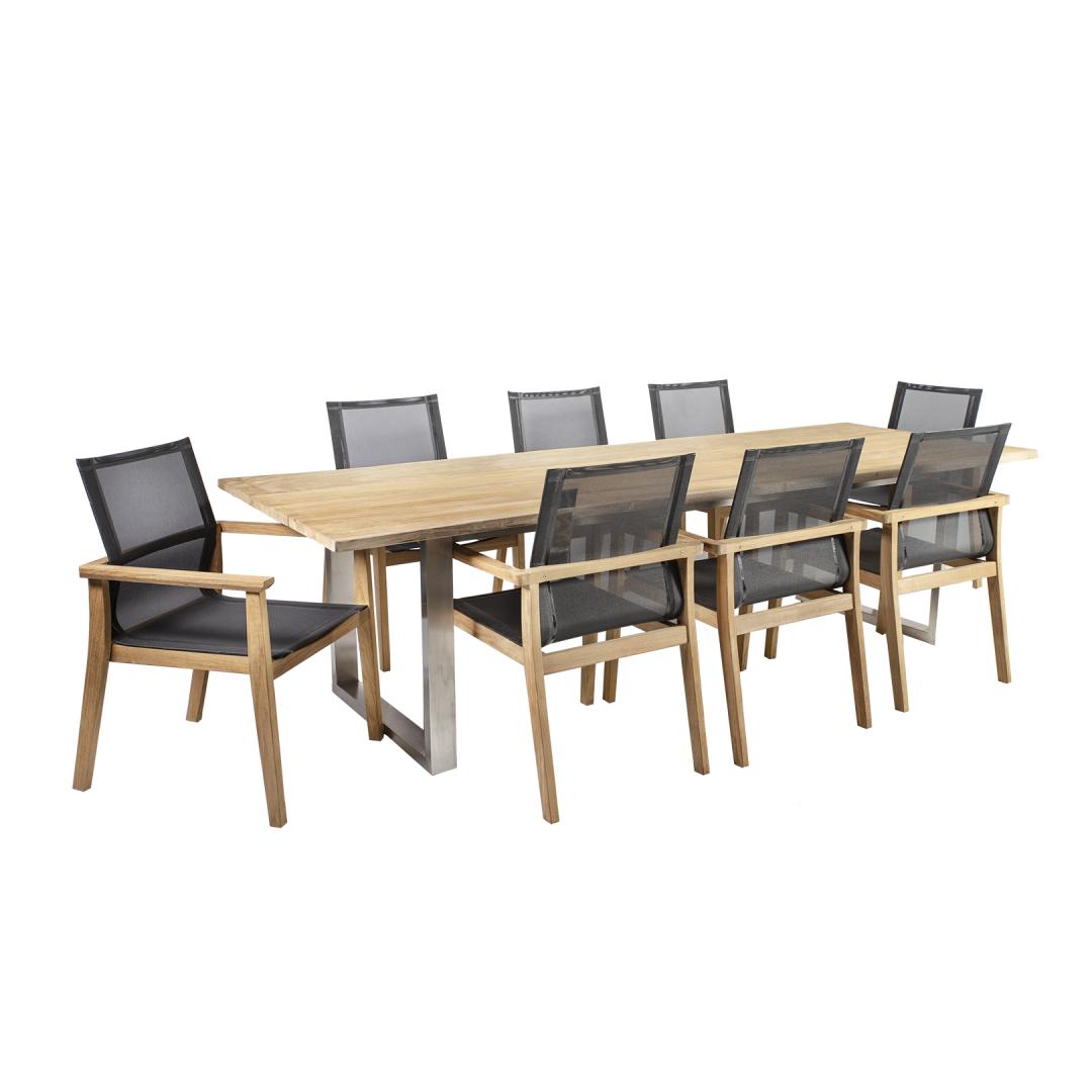 Söögilauakomplekt NAUTICA laud ja 8 tooli. Laua mõõdud on 280x100xH76cm. Kolmest paneelist koosnev servamata äärtega lauaplaat on valmistatud A-klassi tiikpuust. Peenlihvitud rustik viimistlusega pind on täielikult naturaalne oma looduslikus ilus ning seda ei ole õlitatud ega muul viisil keemiliselt töödeldud. Laua jalad ja alusraam on valmistatud roostevabast terasest. A-klassi tiikpuu on täiuslik looduslik materjal luksusliku õuemööbli valmistamiseks. Puidu süü on tihe ja ühtlane ning kauni sametise läikega, värvus on kuldse nisu-ja meetoonides. Tänu suurele looduslike õlide sisaldusele on tiikpuu väga vastupidav niiskuse ning puidukahjurite suhtes. Tiikpuu talub väga hästi erinevaid ilmastikutingimusi ja säilitab oma suurepärase välimuse ja parimad omadused pikkadeks aastateks. Päikesevalguse ja niiskuse mõjul muutub laua pind aja jooksul kaunilt hõbehalliks. Selline värvimuutus on loomulik ning ei mõjuta puidu kvaliteeti. Eksklusiivne tiikpuust laud sobib hästi ka siseruumides kasutamiseks. Tooli raam on valmistatud peenlihvitud, õlitamata tiikpuust. Iste ja seljatugi on valmistatud mustast batylinest. Batyline materjali kõige olulisem omadus on selle nõtkus ja optimaalne istumismugavus. Lisaks erakordsele mehaanilisele tugevusele on materjalil kõrge keemiline vastupidavus. Sünteetiline kate tagab ülikõrge ilmastiku- ja UV-kindluse. Batyline ei ima niiskust, tänu sellele kuivab materjal väga kiiresti ja on maksimaalselt pleki- ja hallituskindel ning lihtsalt puhastatav. Tooli üldmõõdud on 64x65xH90cm. Istme laius 47,5cm, istme sügavus 48cm, istme kõrgus 43cm. Seljatoe kõrgus 48cm, käetoe kõrgus maast 66cm. Kaalupiirang 120kg. Toolid on virnastatavad. HOOLDUS: puhastage mööblit regulaarselt, kaitske liigniiskuse ja UV kiirguse eest. Puidust pindade värskendamiseks võib need soovikorral kergelt üle lihvida. HOIUSTAMINE: suvehooaja lõppedes soovitame aiamööblit hoiustada siseruumides. Puhastage ja kuivatage mööbel enne hoiule panekut. Kasutage hoiustamiseks kuiva ning hea ventilatsiooniga ruumi.