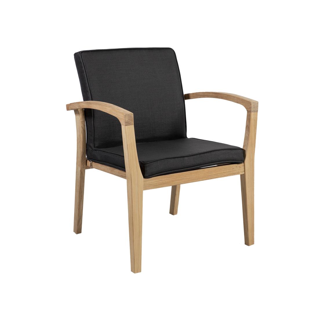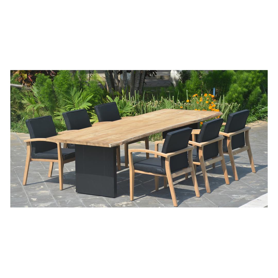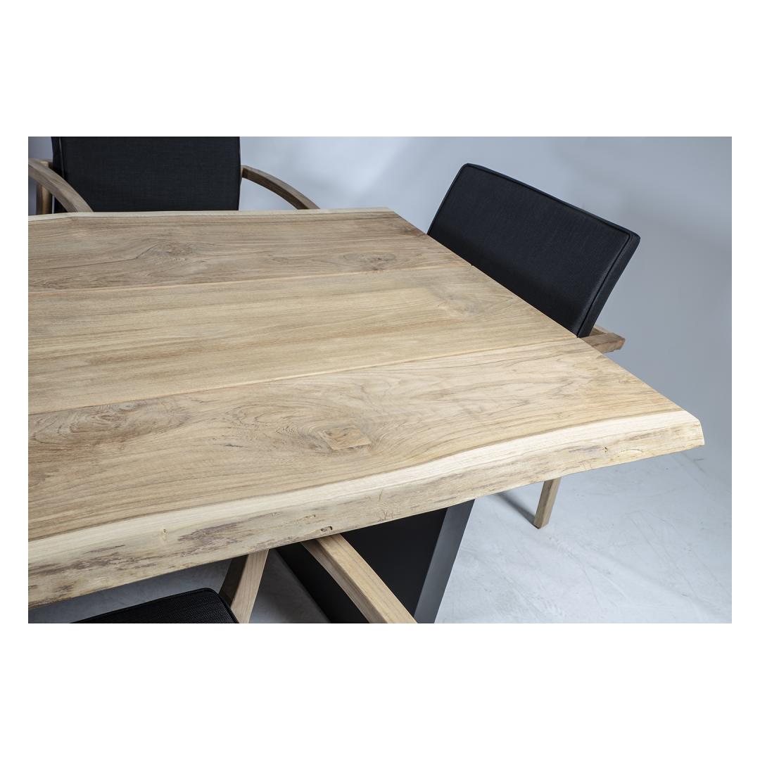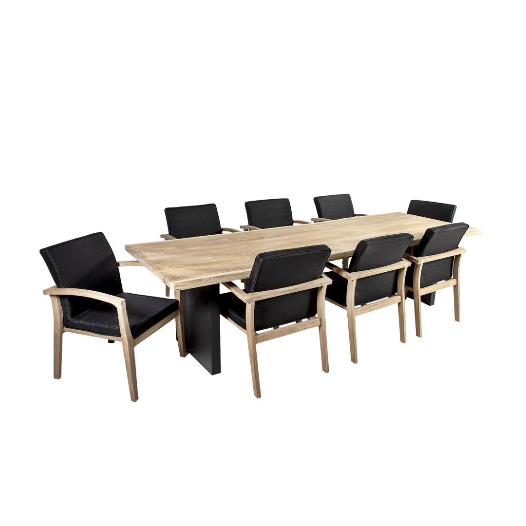 Söögilaiakomplekt ROYAL laud ja 8 tooli. Laua mõõdud on 290x100x76cm. Kolmest paneelist koosnev servamata äärtega lauaplaat on valmistatud A-klassi tiikpuust. Peenlihvitud rustik viimistlusega pind on täielikult naturaalne oma looduslikus ilus ning seda ei ole õlitatud ega muul viisil keemiliselt töödeldud. Laua jalad on valmistatud alumiiniumist ja viimistletud halli pulbervärviga. A-klassi tiikpuu on täiuslik looduslik materjal luksusliku õuemööbli valmistamiseks. Puidu süü on tihe ja ühtlane ning kauni sametise läikega, värvus on kuldse nisu-ja meetoonides. Tänu suurele looduslike õlide sisaldusele on tiikpuu väga vastupidav niiskuse ning puidukahjurite suhtes. Tiikpuu talub väga hästi erinevaid ilmastikutingimusi ja säilitab oma suurepärase välimuse ja parimad omadused pikkadeks aastateks. Päikesevalguse ja niiskuse mõjul muutub laua pind aja jooksul kaunilt hõbehalliks. Selline värvimuutus on loomulik ning ei mõjuta puidu kvaliteeti. Eksklusiivne tiikpuust laud sobib hästi ka siseruumides kasutamiseks. Tooli raam on valmistatud peenlihvitud, õlitamata tiikpuust. Polsterdatud iste ja seljatugi on kaetud musta batyline kattega. Batyline materjali kõige olulisem omadus on selle nõtkus ja optimaalne istumismugavus. Lisaks erakordsele mehaanilisele tugevusele on materjalil kõrge keemiline vastupidavus. Sünteetiline kate tagab ülikõrge ilmastiku- ja UV-kindluse. Batyline ei ima niiskust, tänu sellele kuivab materjal väga kiiresti ja on maksimaalselt pleki- ja hallituskindel ning lihtsalt puhastatav. Tooli üldmõõdud on 64x65xH90cm. Istme laius 50cm, istme sügavus 47cm, istme kõrgus 45cm. Seljatoe kõrgus 48cm, käetoe kõrgus maast 67cm. Kaalupiirang 120kg. Toolid on virnastatavad. HOOLDUS: puhastage mööblit regulaarselt, kaitske liigniiskuse ja UV kiirguse eest. Puidust pindade värskendamiseks võib need soovikorral kergelt üle lihvida. HOIUSTAMINE: suvehooaja lõppedes soovitame aiamööblit hoiustada siseruumides. Puhastage ja kuivatage mööbel enne hoiule panekut. Kasutage hoiustamiseks kuiva ning hea ventilatsiooniga ruumi.