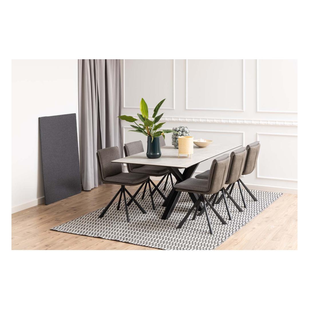 Kaasaegne julge välimusega söögilaud. Laua hallid toonid annavad sellele karge ilme. Lauaplaat on valmistatud kuuma- ja kriimustuskindlast keraamikast. Must skulptuurne metallist ristalus tagab stabiilsuse. Mahutab mugavalt 8 inimest. Toote mõõdud on 200x100xH75,5cm. Kaasaegne julge välimusega söögilaud. Laua hallid toonid annavad sellele karge ilme. Lauaplaat on valmistatud kuuma- ja kriimustuskindlast keraamikast. Must skulptuurne metallist ristalus tagab stabiilsuse. Mahutab mugavalt 8 inimest. Toote mõõdud on 200x100xH75,5cm.