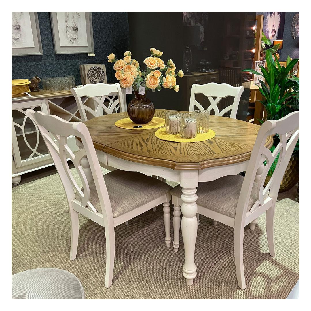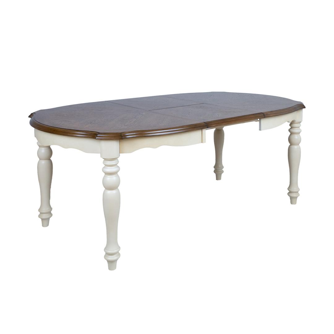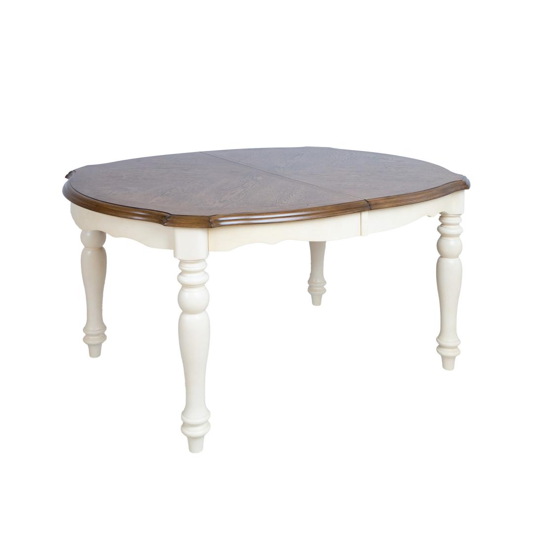 Treitud jalad ja lauaplaadi alusraam on valmistatud kummipuust ning viimistletud antiikvalge värviga.