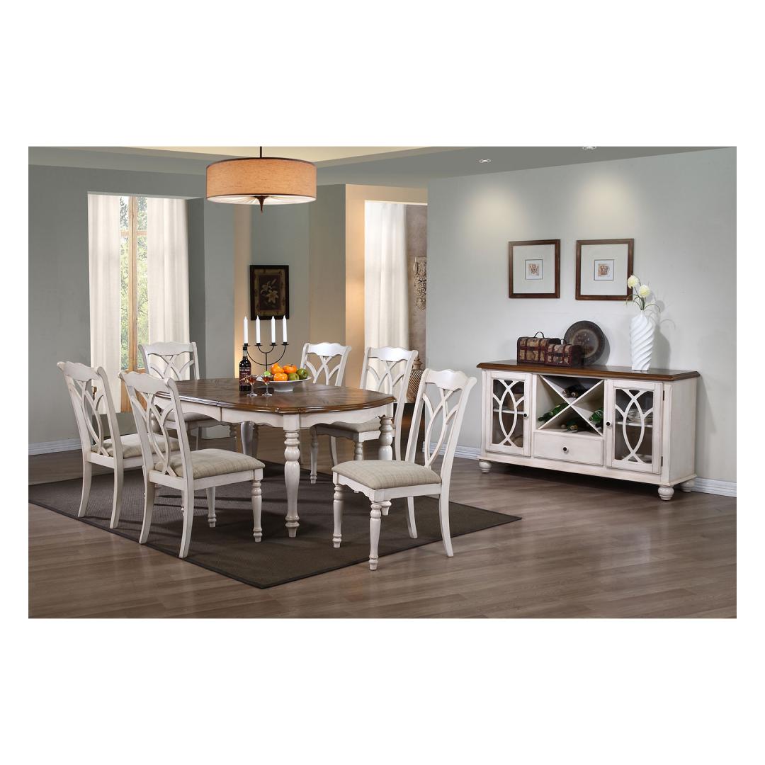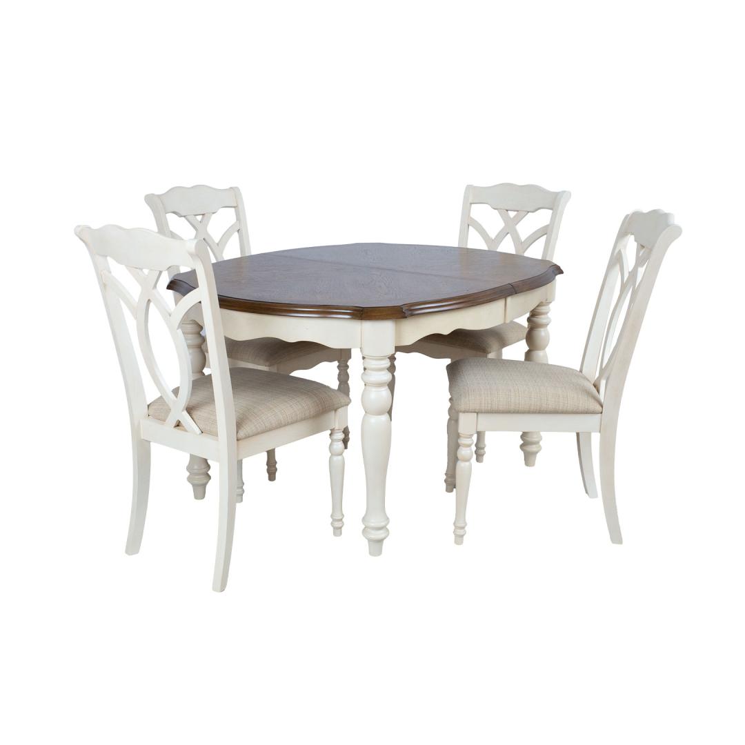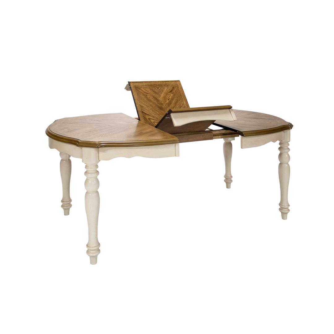 Treitud jalad ja lauaplaadi alusraam on valmistatud kummipuust ning viimistletud antiikvalge värviga.