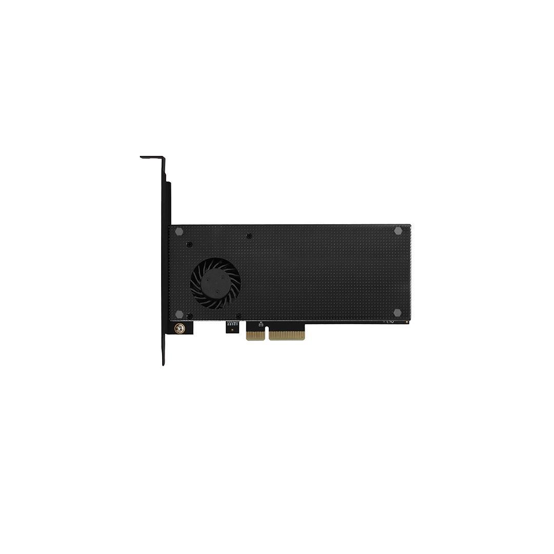 A PCI-Express x4 adapter with a cooler to connect up to two M.2 disks to a computer. 1x NVMe M-key + 1x SATA B-key.