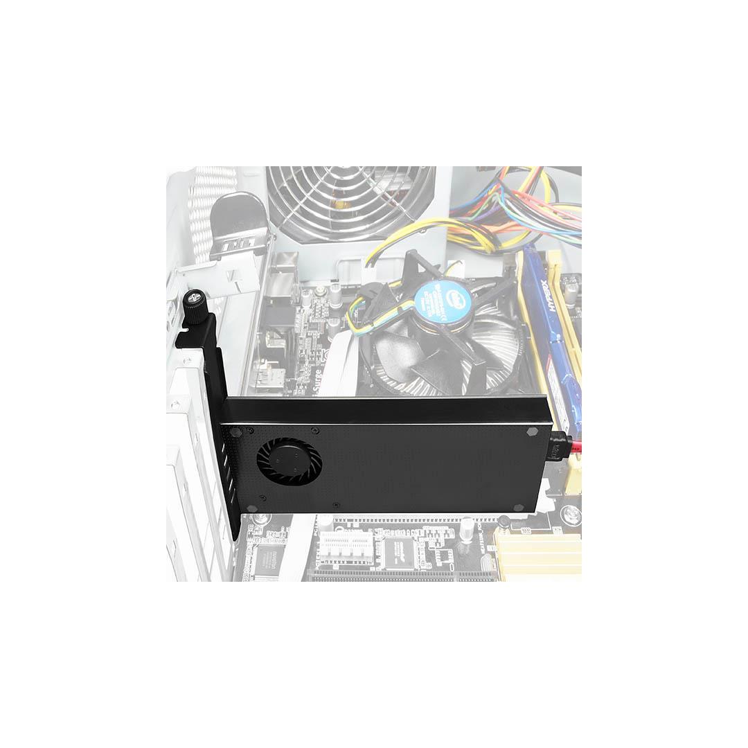 The high quality card design, including copper-plated vents, assists in a better dissipation of heat generated during the M.2 SSDs operation. A metal cover with fan and an attached passive cooler, incl. thermal pads, assist in M.2 SSDs cooling. It results in an ideal combination of passive and active cooling of M.2 SSDs and heat removal. Thanks to the cooling and temperature reduction by up to 35°C, it is possible to use the maximum power of deployed SSDs.