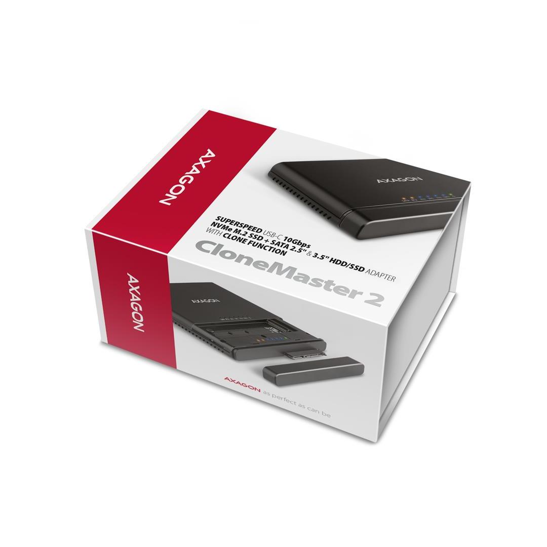 The AXAGON ADSA-CC CLONE MASTER 2 universal USB-C 10Gbps adapter connects up to two drives to your computer quickly and easily at the same time. Easily connect any 2.5" or 3.5" drive directly to the adapter's external SATA connector. Simply insert the NVMe M.2 drive into the adapter body without the use of a screwdriver or other tools. You can also connect a SATA M.2 drive to the adapter using an external adapter such as the AXAGON RSS-M2SD.