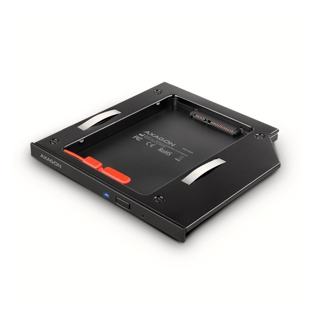The AXAGON RSS-CD09 internal frame is designed to be mounted instead of the existing 9.5 mm CD/DVD drive. It is designed for 2.5" SSD/HDD SATA drives. You can easily replace the optical drive in your laptop with a hard drive.