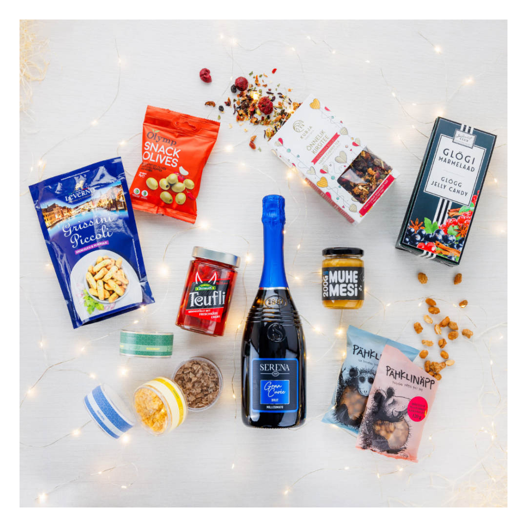 Üllatage oma häid kolleege ja koostööpartnereid Kaupmehe kinkekorviga! TELLIMINE: üle 50tk tellimisel on pakkimise aeg 2-5 päeva. Tellimiseks lisa ostukorvi soovitud kogus ja kirjuta tellimuse kinnitamisel kommentaari soovitud kättesaamise aeg. Tellimuse täpsustamiseks võtame Teiega ühendust! PAKIS PEIDUS: PÄHKLINÄPP Röstitud maapähklid BBQ 60g PÄHKLINÄPP Röstitud maapähklid karamellis 120g SAILOR Soolahelveste komplekt 4x40g MUHE Mesi 200g LEVERNO Minigrissiinid küüslaugu ja peterselli 100g Gourmet Club Glögi marmelaad 120 g OLYMP Rohelised kivideta oliivid tšilli ja ürtidega 70g OLYMP Kalamata rohelised kivideta oliivid ürtidega 70g DITTMANN Pikantsed punased pepperonid toorjuustuga 290g KUBJA Õnnelik Kirsitee Rõõmuga Sulle! taimetee 100g SERENA SPUMANTE GRAN CUVEE BRUT MILLESIMATO 11% 75CL NB! Kaupmees jätab endale õiguse teha muudatusi korvide sisus!
