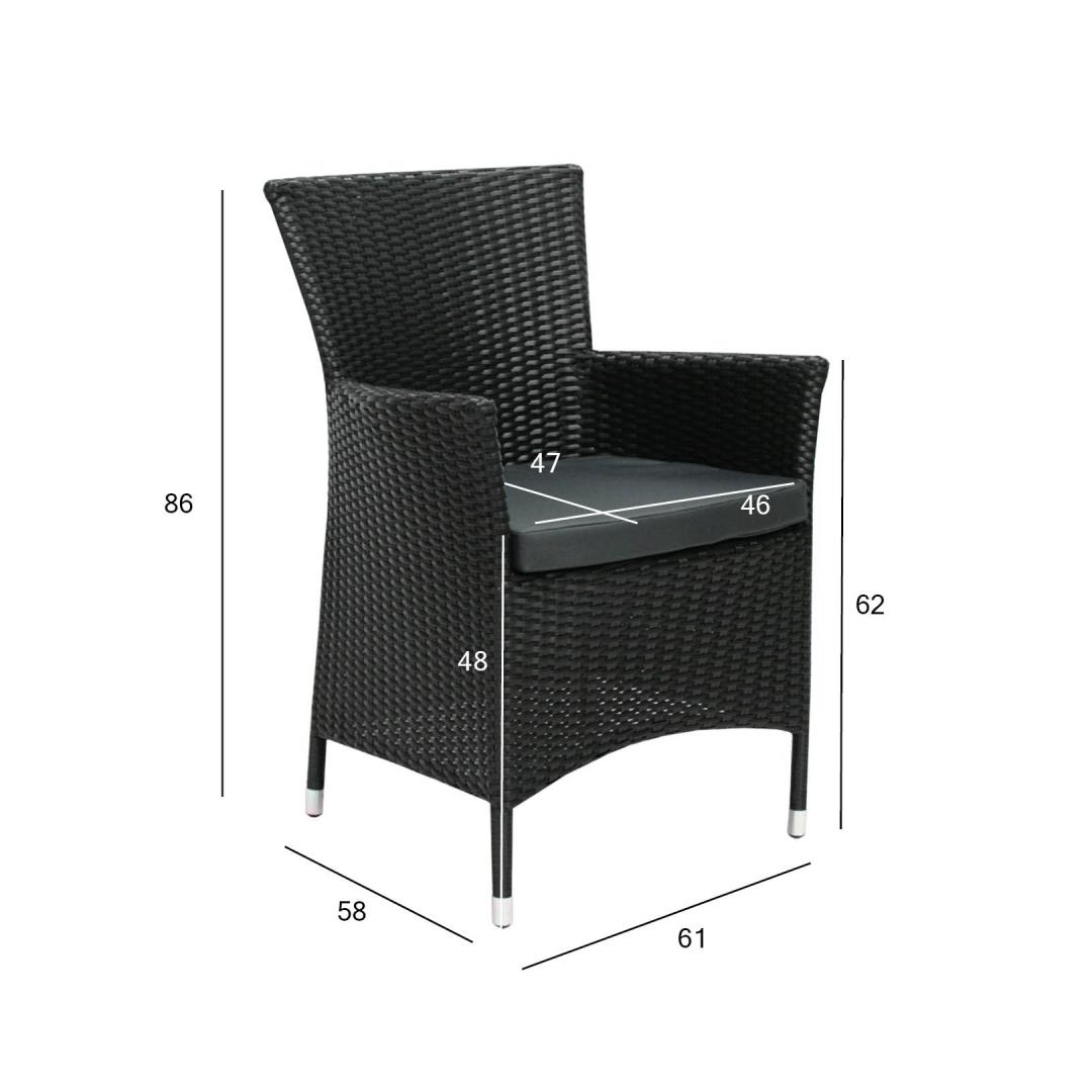 Tool WICKER-1 61x58xH86cm, must. Klassikaline plastikpunutisega aiatool on mugav, vastupidav ja ilmastikukindel ning sobib hästi nii koduaeda kui kohvikusse. Tool on kombineeritav teiste WICKER MIX&MATCH sarja toodetega. Tooli tugev ja stabiilne terasraam on kaetud plastikpunutisega. Istmepadi kuulub komplekti. Padja mõõdud 46x47x4,5cm. Padjakate on valmistatud polüesterkangast. Tooli üldmõõdud on 61x58xH86cm. Istme laius 46cm, istme sügavus 47cm, istme kõrgus 48cm. Käetoe kõrgus maast 62cm. Kaalupiirang 120kg. HOIUSTAMINE: suvehooaja lõppedes soovitame aiamööblit hoiustada siseruumides. Puhastage ja kuivatage mööbel enne hoiule panekut. Kasutage hoiustamiseks kuiva ning hea ventilatsiooniga ruumi.