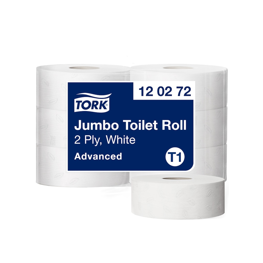 Tork Jumbo süsteem tähendab tõhusat ajakasutust, vähenevaid kulusid ja rohkem tualettpaberit standardsete rullidega võrreldes. 2-kihiline rulltualettpaber Tork Jumbo Advanced võimaldab hoida kulud ja jõudluse tasakaalus ning sobib täiuslikult suure külastajate arvuga kohtadesse.