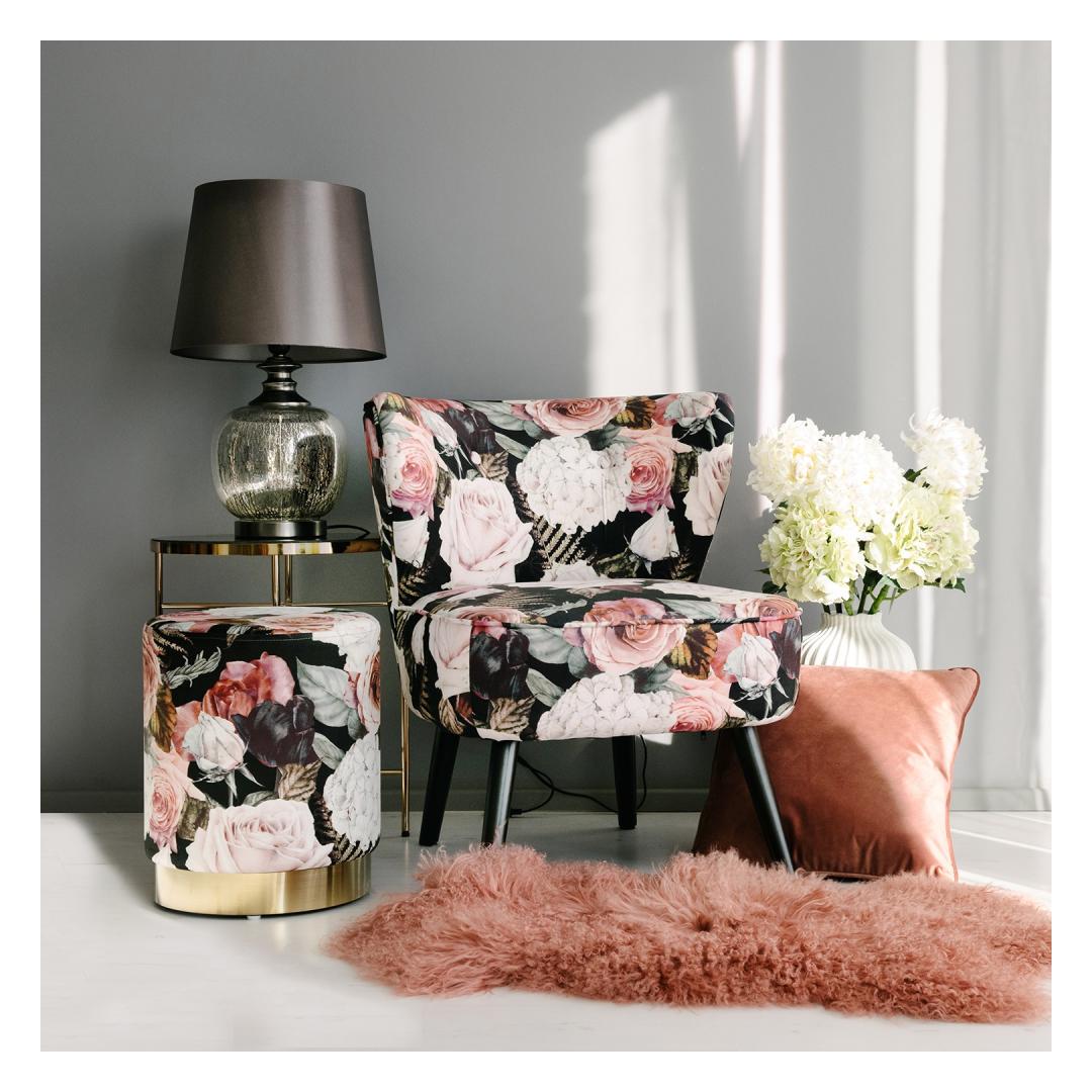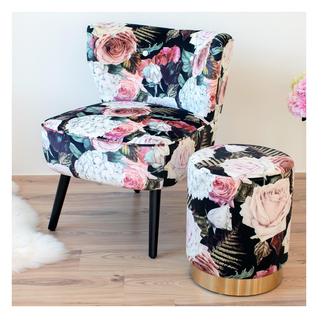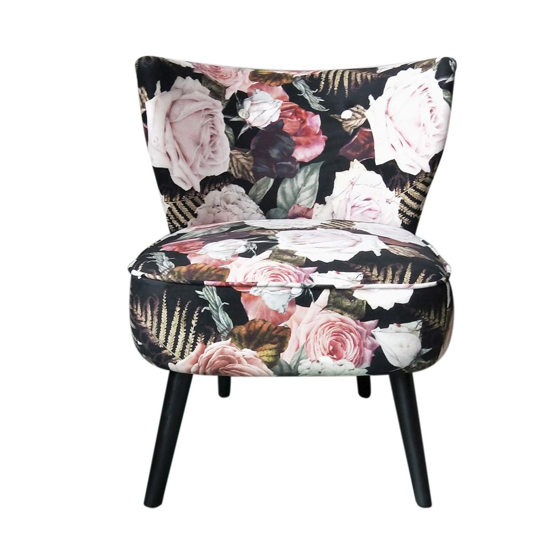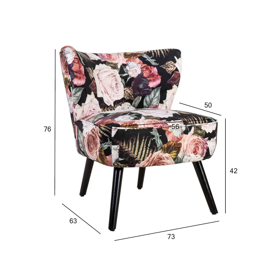 Tugitool LA PERLA lilleline. Tugitool on kaetud roosi mustriga sametkangaga, 100% polüester. Tugitoolil on puitraam ja polüester pehmendus. Tugitooli mõõdud on 63x73xH76cm.