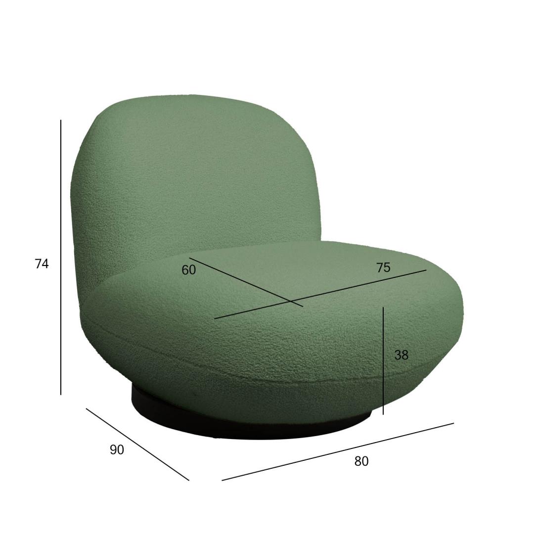 Tugitooli üldmõõdud on 80x90xH74cm. Istme laius 75cm, istme sügavus 60cm, istme kõrgus 38cm. Tugitool PAMELA roheline.